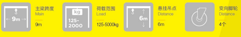 RST可移動式門吊起重量125kg至5000kg;跨度達9m;梁下高度可達6m;并具有4個可變向定位腳輪、移動輕松。